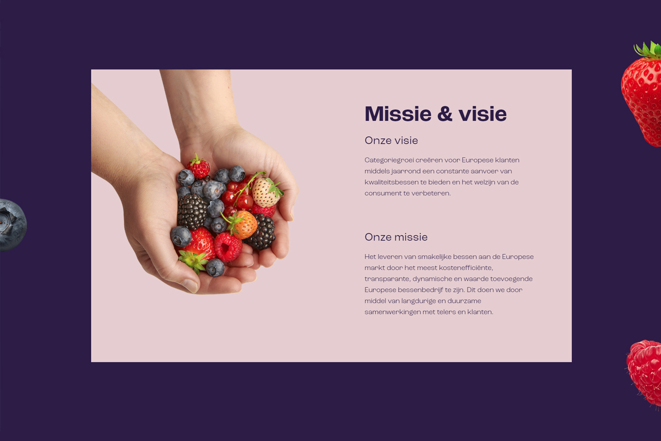 Vorig jaar zijn wij een nieuwe zusteronderneming van Nature’s Pride gestart: Berries Pride, gericht op zachtfruit. Ook hiervoor hebben we met Panorama Studios samengewerkt voor het design en ontwikkeling van de website. Net als bij de andere projecten was de samenwerking met Panorama heel fijn, niet alleen qua communicatie, planning en budget, maar ook door hun expertise. Het design moest niet alleen passen bij de huisstijl maar zeker ook zeer gebruiksvriendelijk zijn. Zij kwamen hiervoor met hele goede ideeën waar wij direct enthousiast over waren. We zijn dus ook heel blij met onze samenwerking bij dit project, én meer dan trots op het eindresultaat!