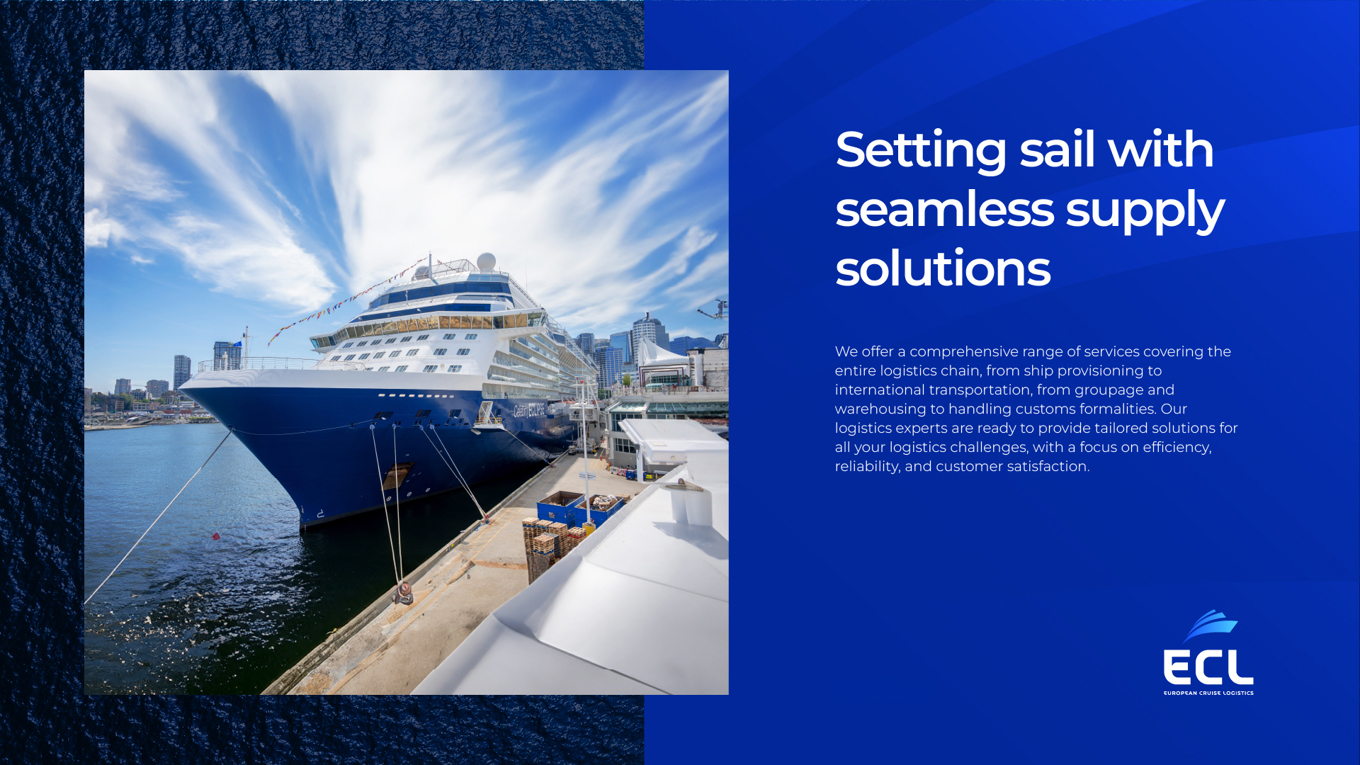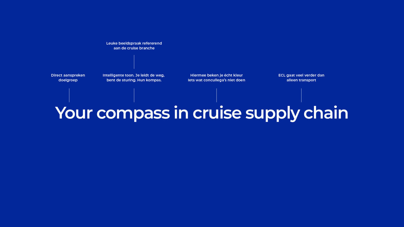 Samen met ECL doken we in hun wereld. Een wereld waar logistiek geen bijzaak is maar de stille motor achter een vlekkeloze cruise-ervaring. Dat zie je terug in de branding: strak en overzichtelijk, met een knipoog naar de maritieme wereld. ⚓
