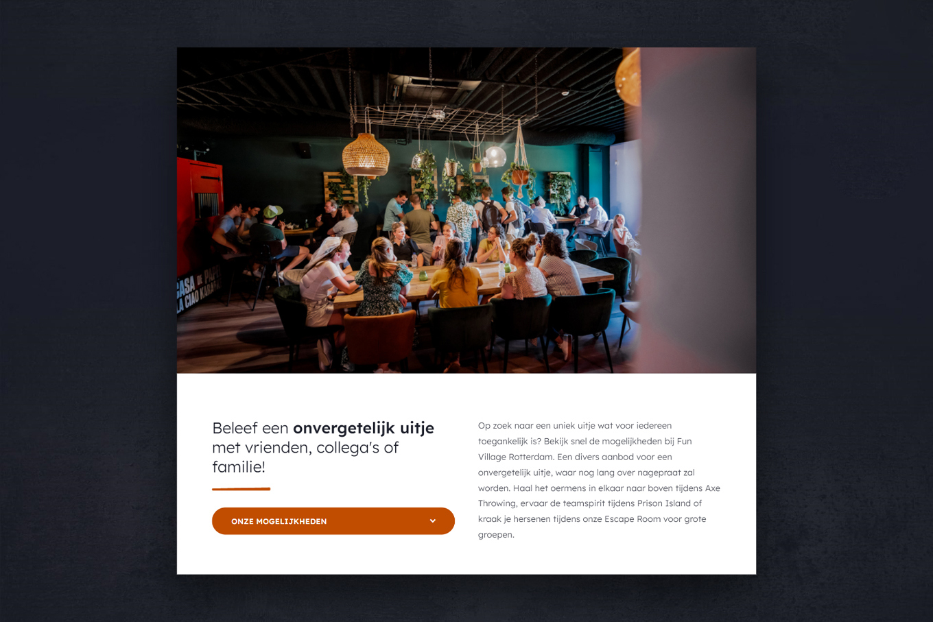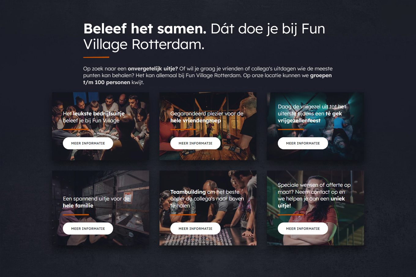 Op zoek naar een onvergetelijk uitje? Dan kom je al snel bij Fun Village uit Rotterdam uit. Aan ons de taak om op de oriënterende bezoeker de juiste beleving over te brengen.