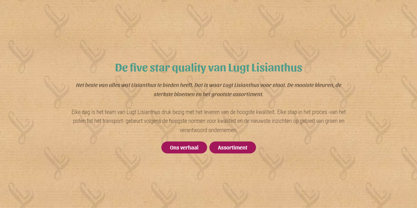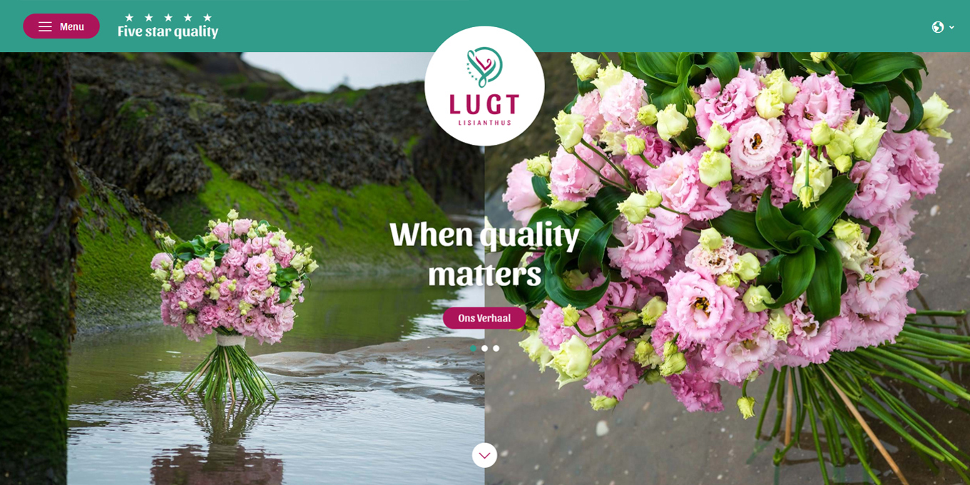 Het beste van alles wat Lisianthus te bieden heeft. Dat is waar Lugt Lisianthus voor staat. De mooiste kleuren, de sterkste bloemen en het grootste assortiment. Dan kon de 'five star quality' waar Lugt Lisianthus mee schermt natuurlijk niet ontbreken in de branding. Panorama Studios dacht mee over de positionering en naamgeving, verzorgde een evolutie in huisstijl en voerde deze door in een nieuwe website, hoezen en diverse middelen.