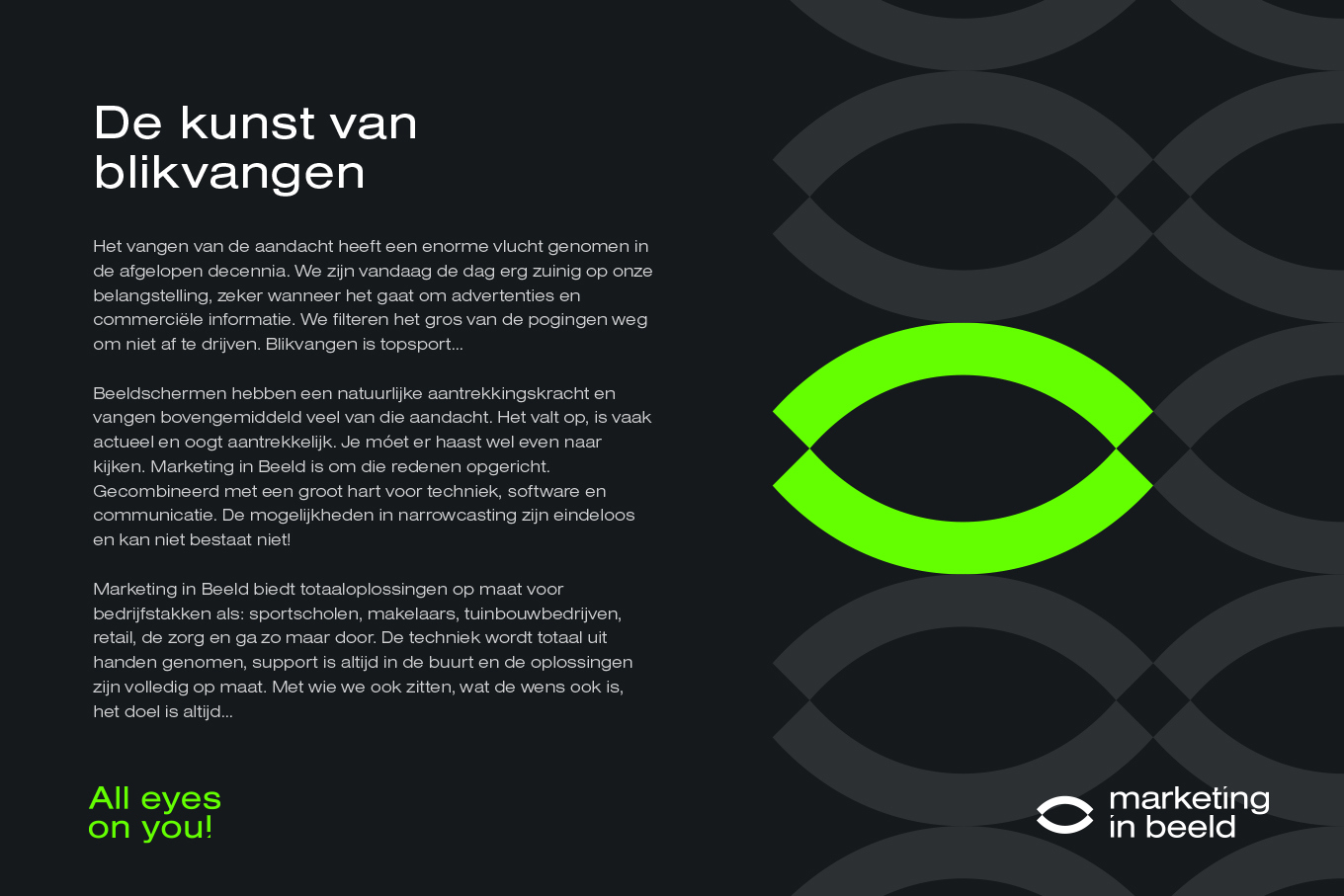 Beeldschermen hebben een natuurlijke aantrekkingskracht en vangen bovengemiddeld veel van die aandacht. Het valt op, is vaak actueel en oogt aantrekkelijk. Je móet er haast wel even naar kijken. Marketing in Beeld is om die redenen opgericht. Gecombineerd met een groot hart voor techniek, software en communicatie. De mogelijkheden in narrowcasting zijn eindeloos en kan niet bestaat niet!