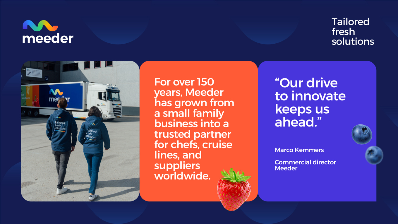Versheid is meer dan een belofte bij Meeder, het is een race tegen de klok. Groenten, fruit, vlees, vis en zuivel vinden via Meeder hun weg naar chef-koks en cruisemaatschappijen wereldwijd, waar timing, kwaliteit en precisie onmisbaar zijn. Vanuit hun diepe wortels in de maritieme sector begrijpt Meeder als geen ander hoe complex deze uitdaging is. Elke levering is een samenspel van discipline, zorg en expertise.