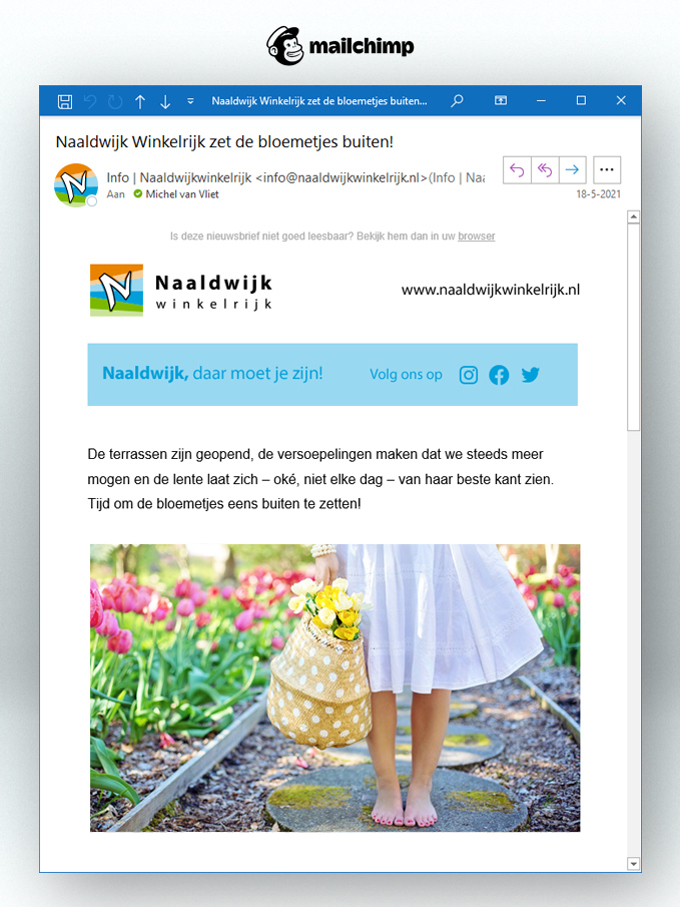 Inmiddels hebben wij de derde generatie website gelanceerd. De oude website heeft jarenlang dienst gedaan, maar was gedateerd geraakt en nodig aan vervanging toe. De rol van de website binnen de communicatiemix is in de loop der jaren veranderd. De website was onnodig uitgebreid in functionaliteiten en draaide op verouderde techniek. Alle winkeliers hebben inmiddels zelf een website en/of zijn actief op social media. De informatievoorziening kon compacter, minder beheer en andere tools konden beter worden ingezet om de communicatiedoelen te behalen. WhatsApp-groepen voor onderlinge communicatie. Social media voor acties, nieuws en vacatures. En door een goede opzet in MailChimp hebben ook de nieuwsbrieven een upgrade gekregen. Naaldwijkwinkelrijk.nl, dáár moet je zijn!