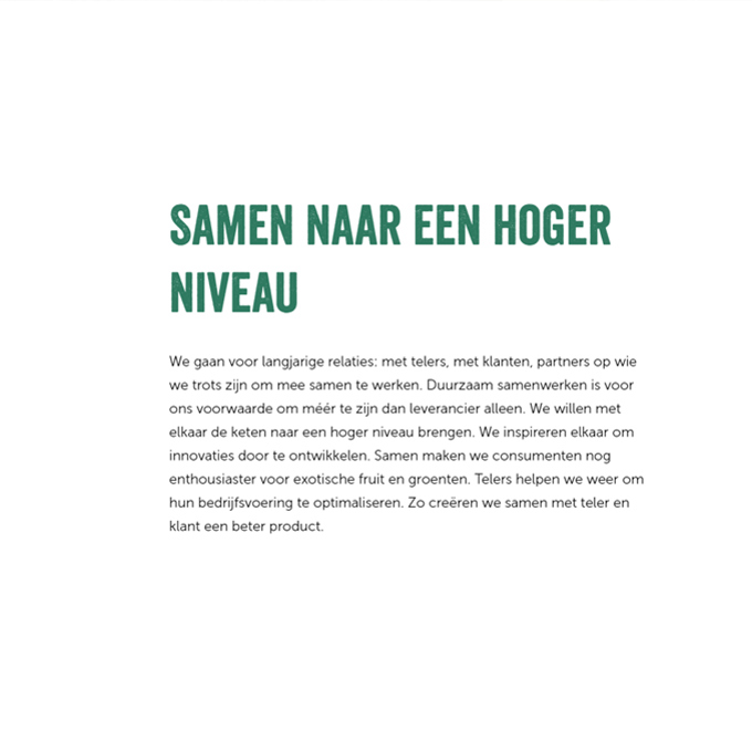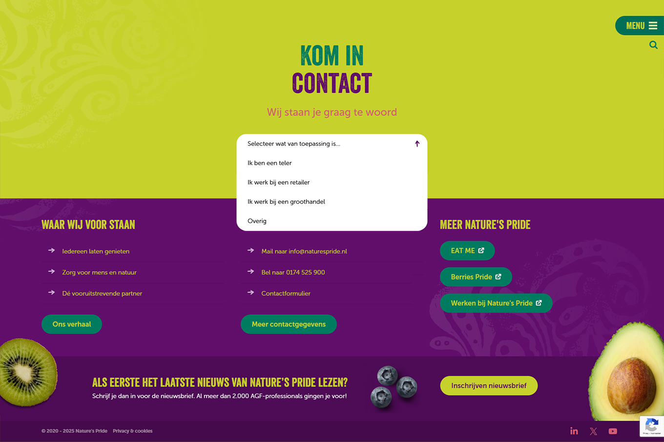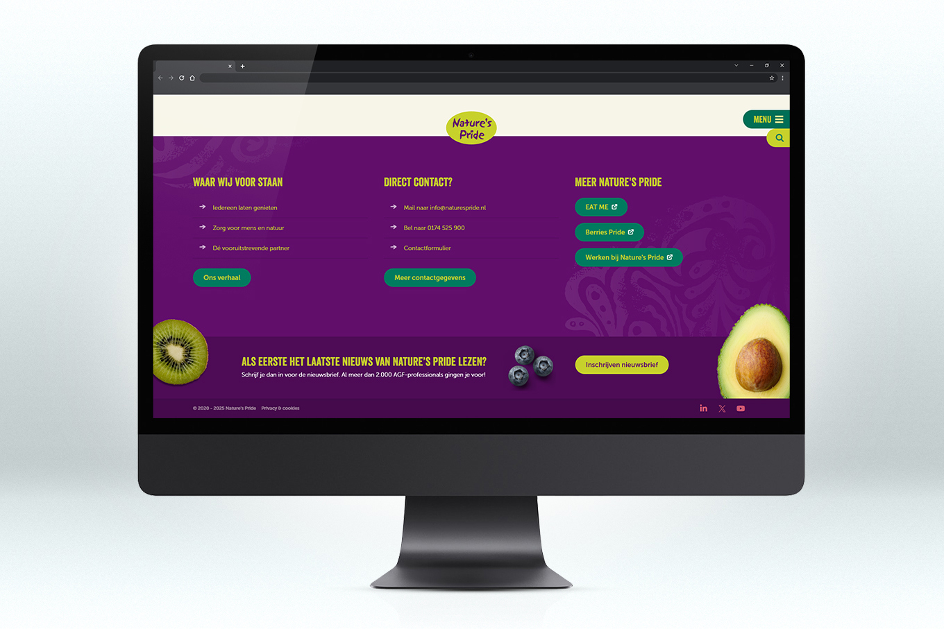 Nature’s Pride is misschien wel het meest bekend als het bedrijf dat de avocado in Europa groot maakte. Of als de pionier achter het proces van het rijpen van exotisch fruit en het verlengen van de houdbaarheid, met Apeel. Maar ze zijn veel meer. Op hun nieuwe B2B-website barstensvol UX en UI design, slimme technieken, state-of-the-art stylingtoepassingen, slimme zoekmachines, call to action forms en een super gebruiksvriendelijk 'maatwerk' Umbraco CMS wordt de bezoeker overladen met wapenfeiten dat dit toch wel een erg mooi en gaaf bedrijf is. Deze site draait als een zonnetje op Umbraco Cloud hosting. Neem zelf maar eens een kijkje...