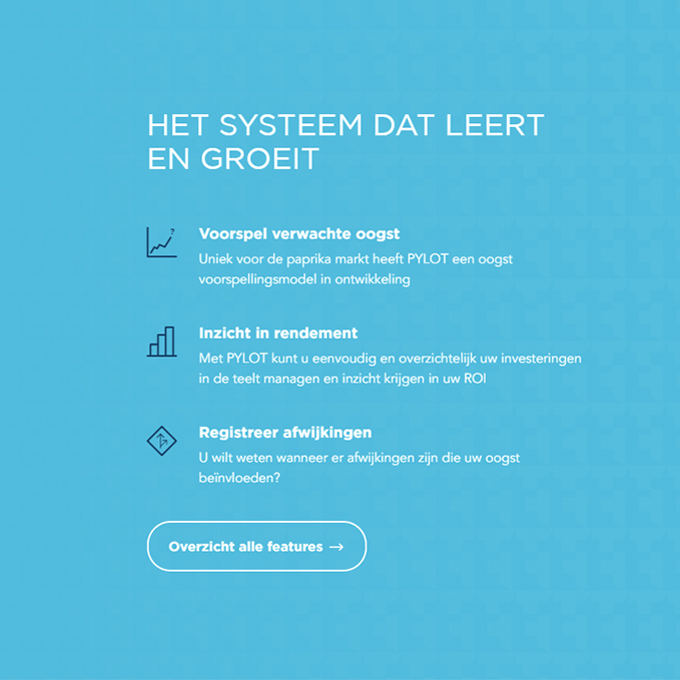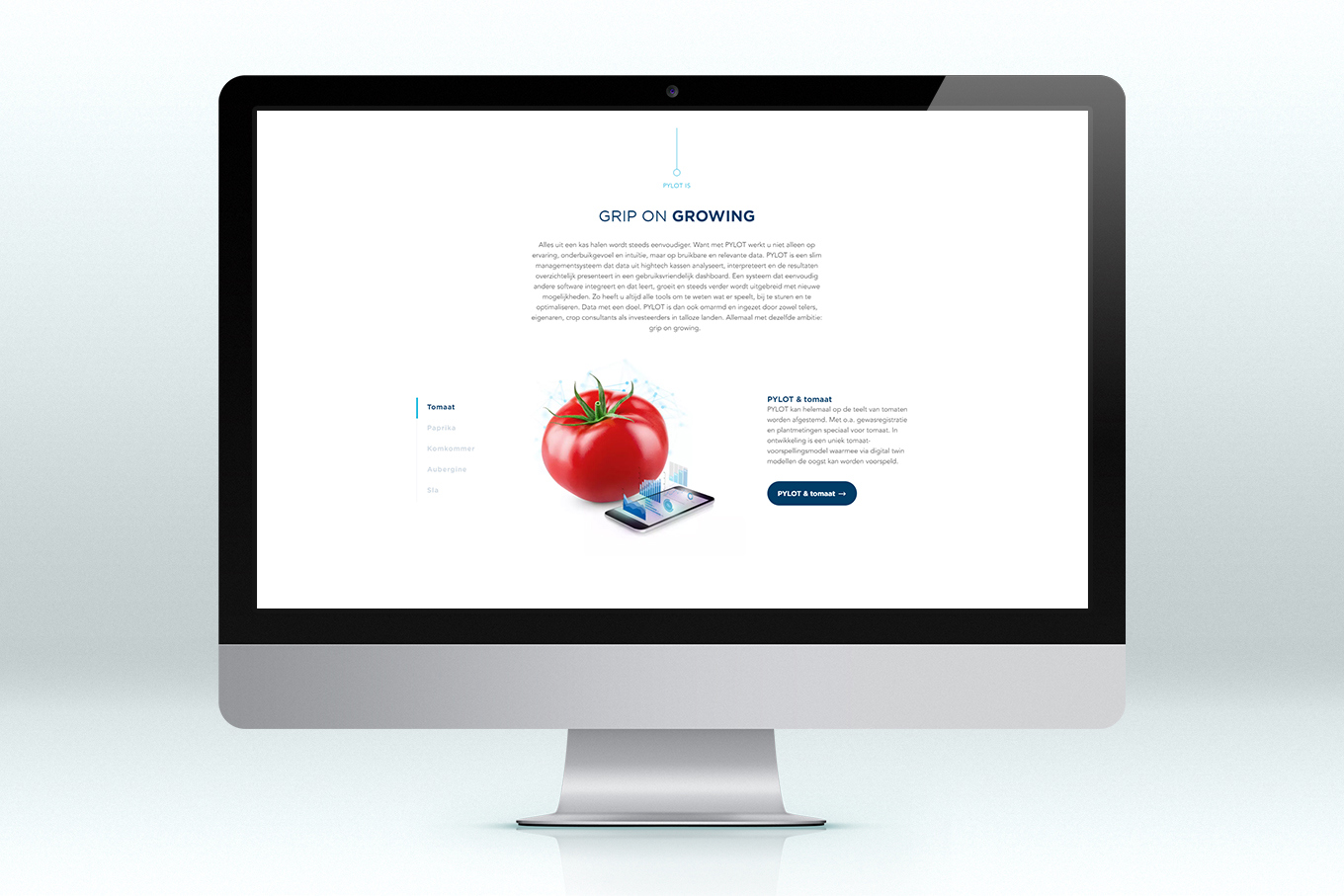 Alles uit een kas halen wordt steeds eenvoudiger. Want met PYLOT werkt u niet alleen op ervaring, onderbuikgevoel en intuïtie, maar op bruikbare en relevante data. PYLOT is een slim managementsysteem dat data uit hightech kassen analyseert, interpreteert en de resultaten overzichtelijk presenteert in een gebruiksvriendelijk dashboard.