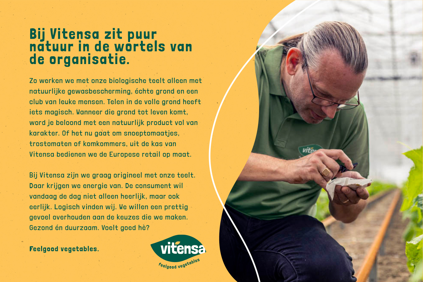 Bij Vitensa zijn we graag origineel met onze teelt. Daar krijgen we energie van. De consument wil vandaag de dag niet alleen heerlijk, maar ook eerlijk. Logisch vinden wij. We willen een prettig gevoel overhouden aan de keuzes die we maken. Gezond én duurzaam. Voelt goed hè?