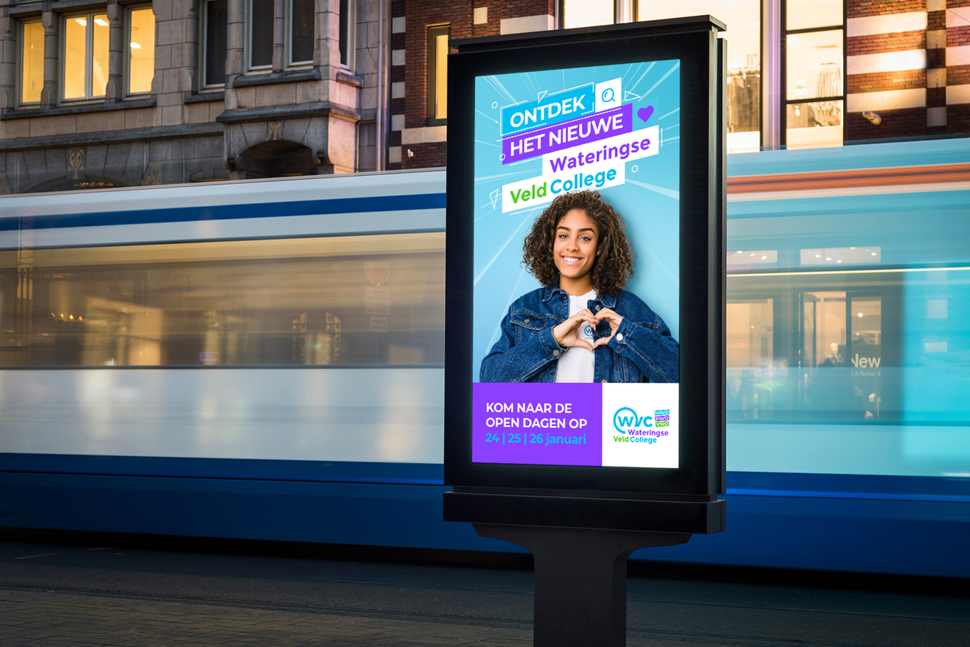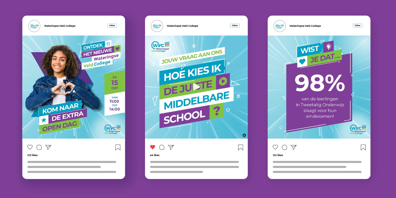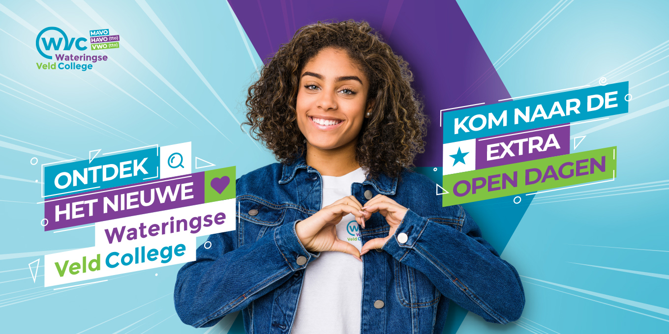 Het Wateringse Veld College benaderde ons om hun communicatie goed op de rit te zetten en ze verder te ondersteunen bij diverse campagnes om hun nieuwe verhaal onder de aandacht te brengen. Dit vertaalt zich door in het opzetten van een nieuwe huisstijl, campagne slogan, tal van middelen, campagnes op social media, acties verzinnen in aanloop naar en tijdens de open dagen en nog veel meer.