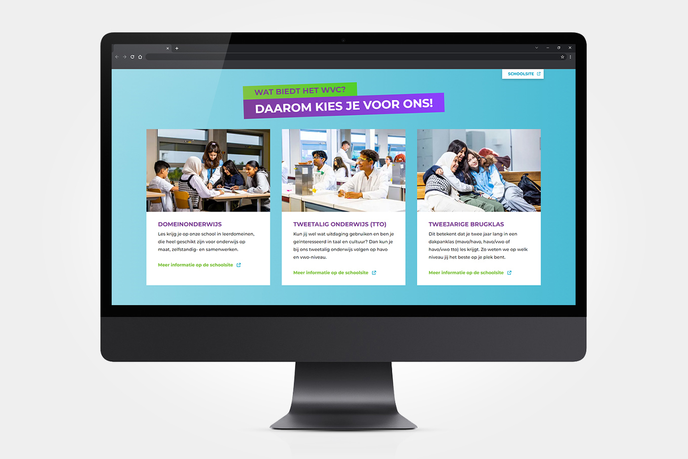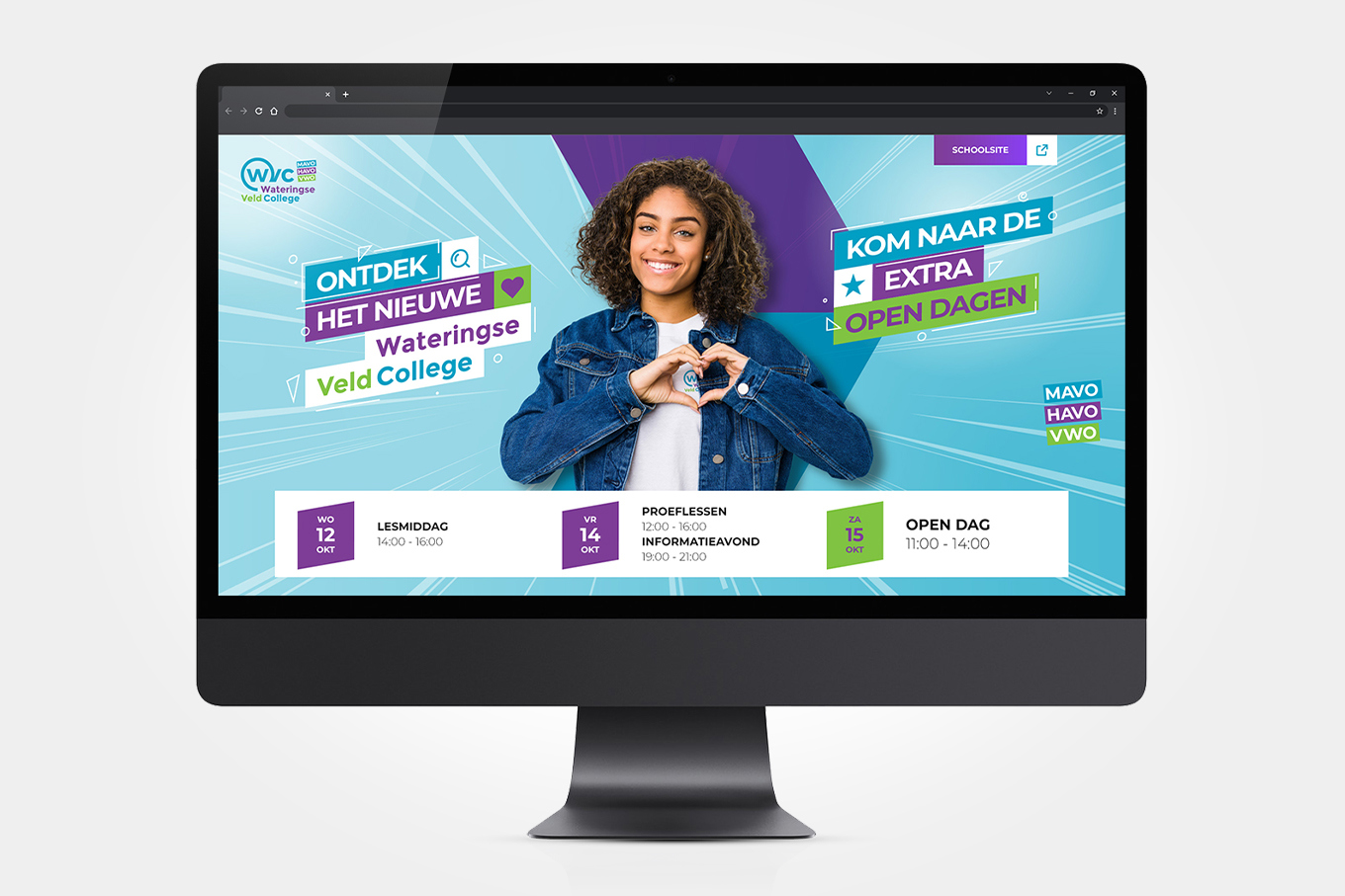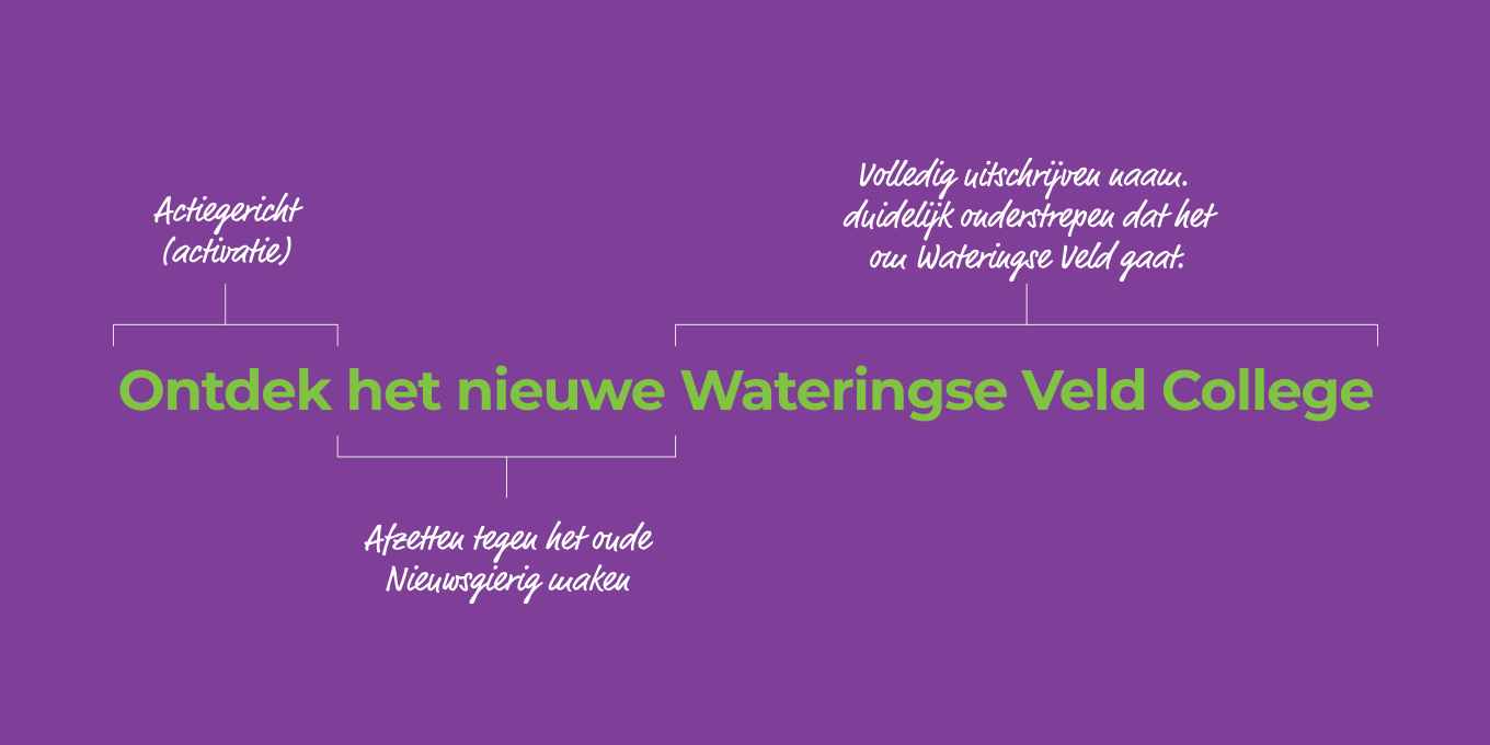 Het Wateringse Veld College benaderde ons om hun communicatie goed op de rit te zetten en ze verder te ondersteunen bij diverse campagnes om hun nieuwe verhaal onder de aandacht te brengen. Dit vertaalt zich door in het opzetten van een nieuwe huisstijl, campagne slogan, tal van middelen, campagnes op social media, acties verzinnen in aanloop naar en tijdens de open dagen en nog veel meer.
