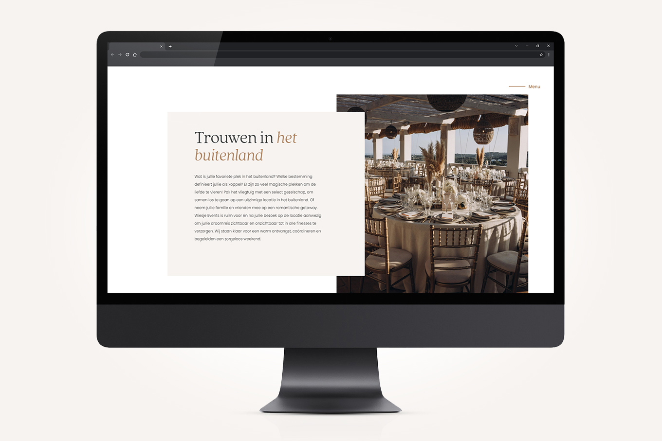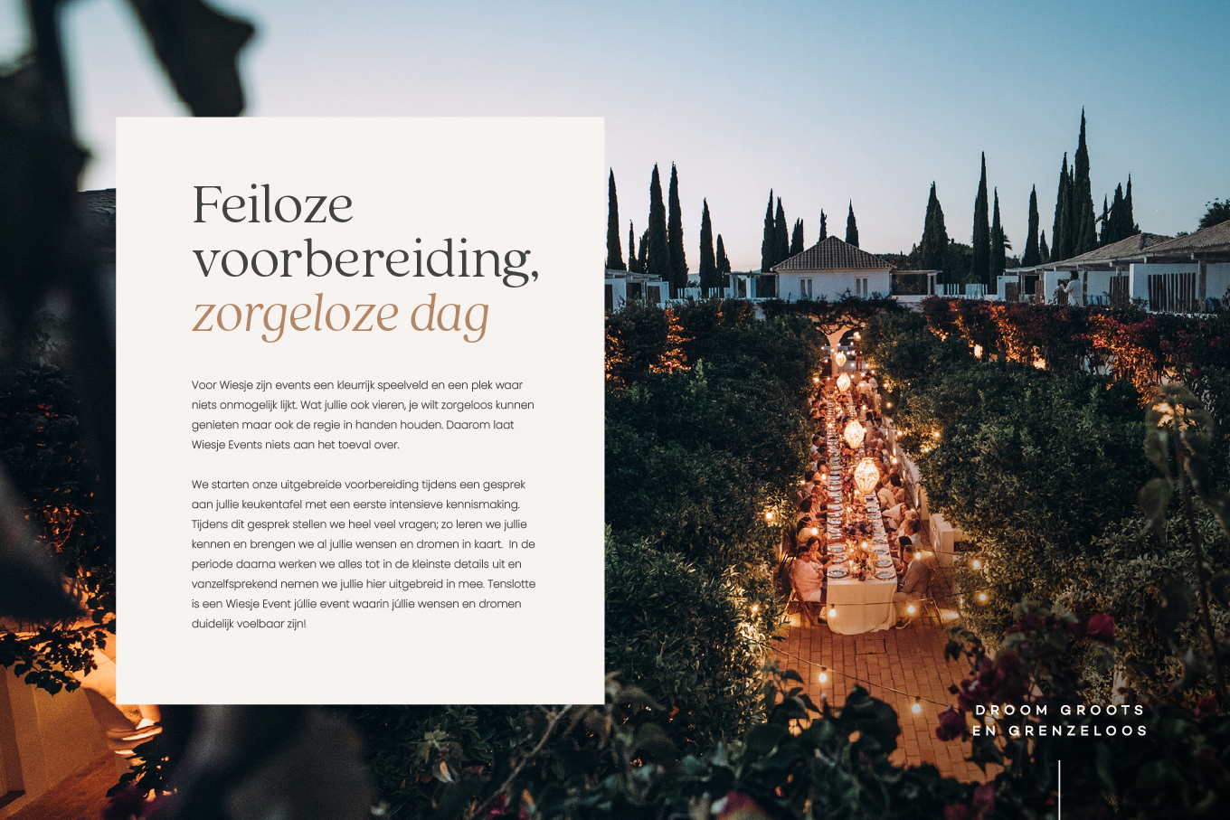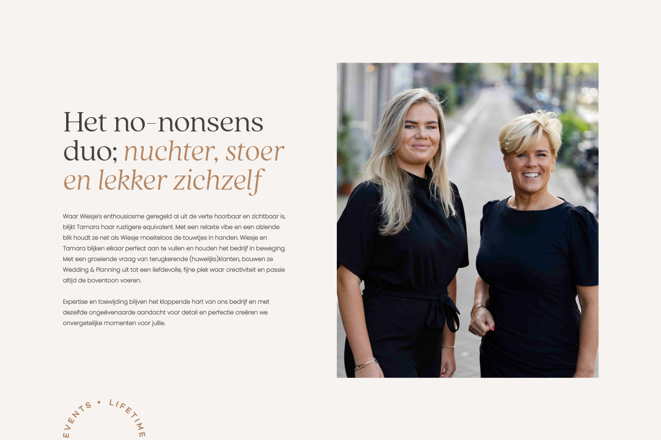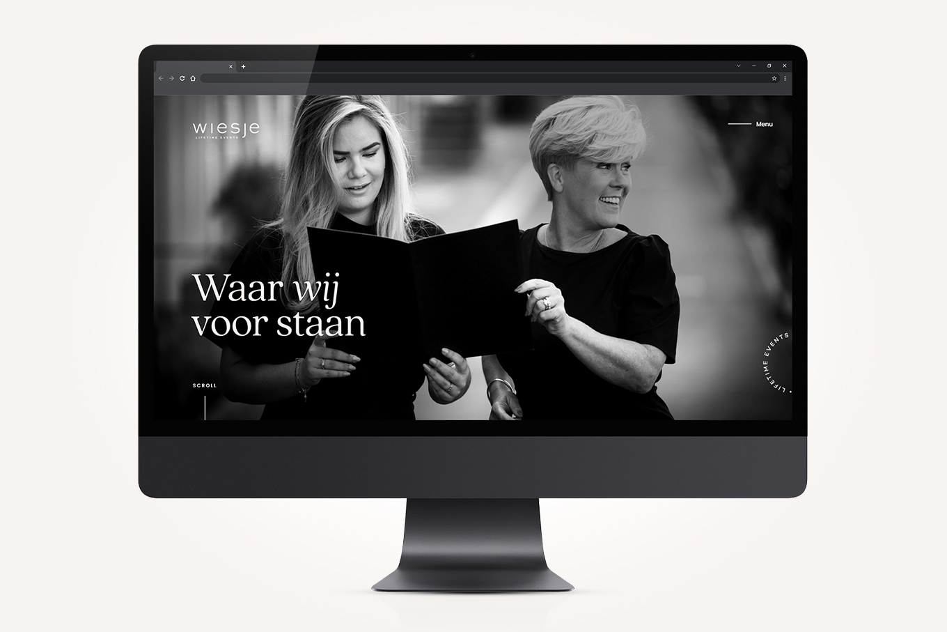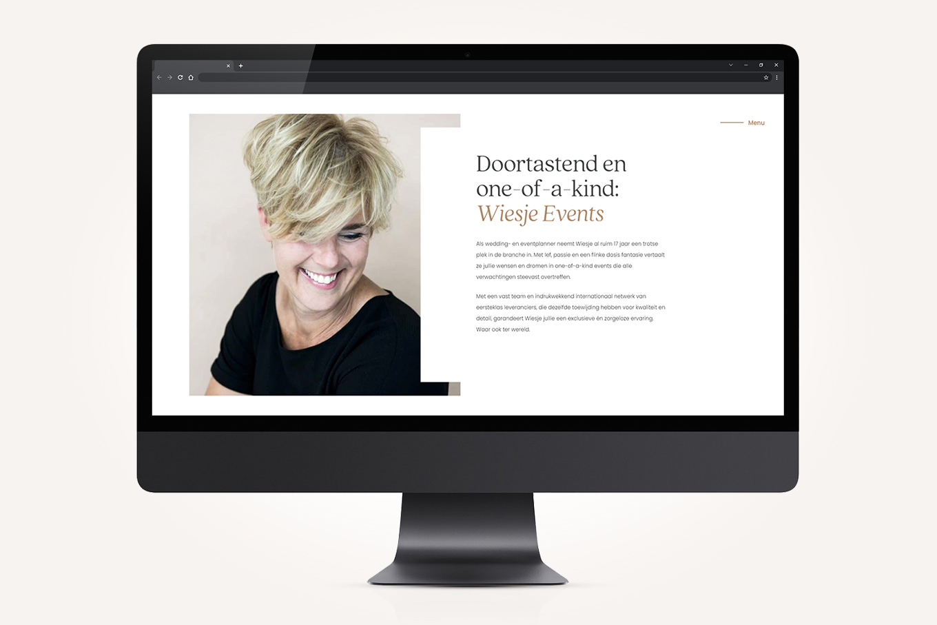 Wiesje klopte met haar eventbureau 'Wedding & Planning' bij ons aan met de wens hun website te vernieuwen. Na wat sessies kwamen we tot de conclusie dat we eigenlijk beter nog even een stapje terug konden doen. Wie zijn we? En waar willen we naar toe? Door de jaren heen heeft het 'merk' Wiesje Hallewas flinke bekendheid gekregen door diverse optredens in de landelijke media en high-profile celebrity events. Naast dat de dienstverlening de naam 'Wedding & Planning' ontgroeid was, rijmde de positionering en branding ook niet meer lekker met de allure die het verdiend. Wij hielpen deze club aan een nieuwe positionering en branding om hun verhaal beter én kwalitatiever over te brengen.